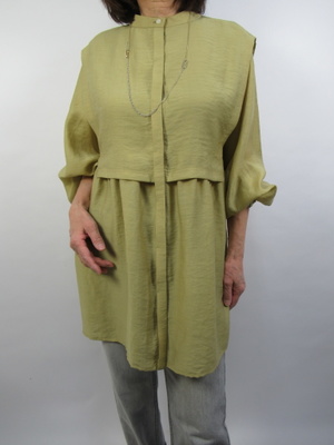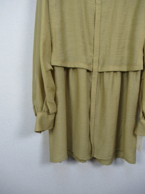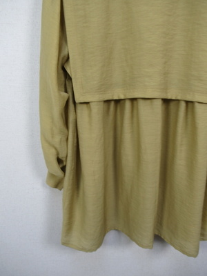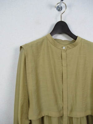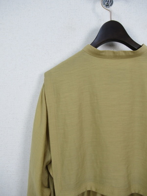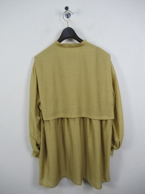 大きな襟のようなデザイン 2枚重ねで脇ボタンで前後をつないでます 光沢感有る生地が特徴 手洗い可能