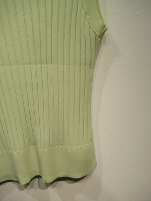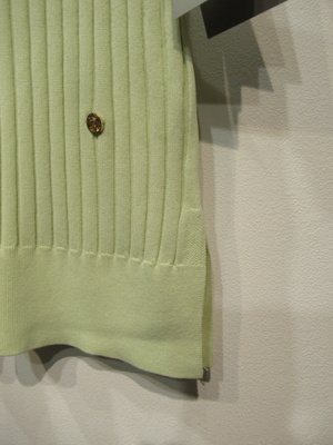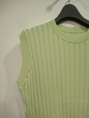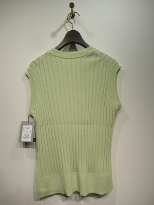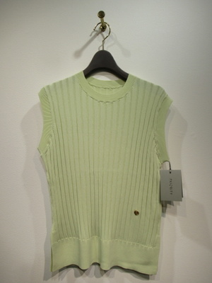 太リブのややフレンチスリーブ、ニットベスト、両脇10pほどスリット入り、袖口・襟ぐり・裾リブ、左下にゴールドのワンポイントパーツあり、手洗い可能