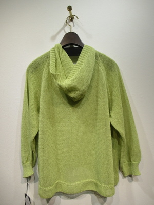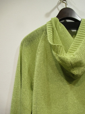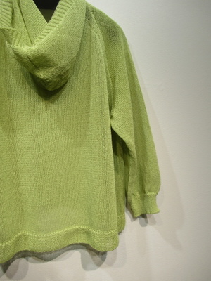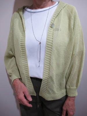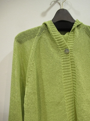 フード襟のカーデ(フロント一つボタン) 袖はラグラン 洗える和紙糸使用 袖口裾 フードの周囲リブ編み 手洗い可能