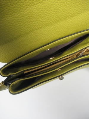 かぶせのバッグ ショルダーと2WAY 中は3層に分かれてて真中は天ファスナー、両端はマグネットとめです 後ろは外ポケット有りです