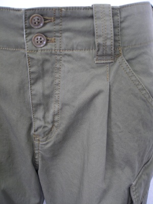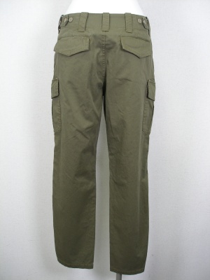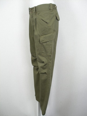 タック入りで裾に向かってややテーパードしたカーゴパンツなのでロールアップしやすい。「グリーン」はやや薄いカーキ色で「カーキ」はやや濃い目のカーキ色、「ネイビー」は黒に近い濃い色です。