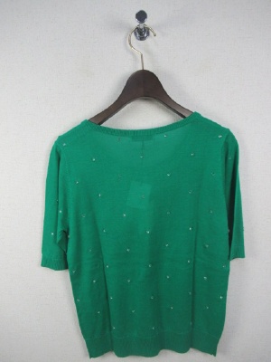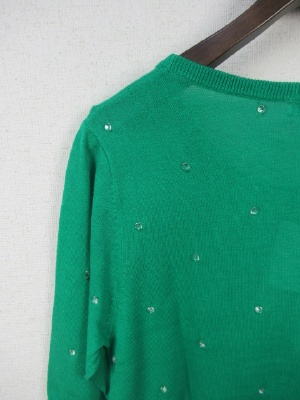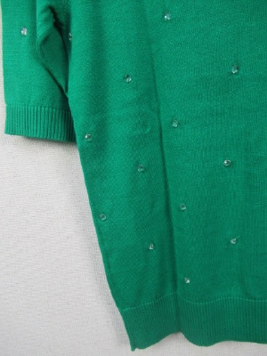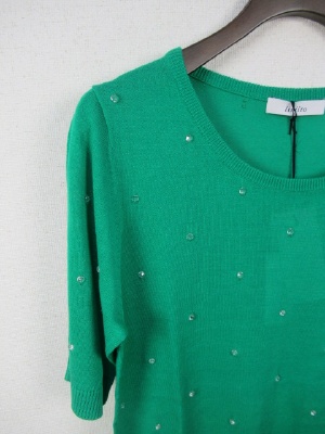 クリスタルなボタンを糸でトッピング クルーネックの5分袖 手洗い可能 そろいのカーデあり