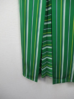スリットに内側がプリーツになったデザイン、ミモレ丈、ウェスト後ろゴム、横ファスナー、裏地あり