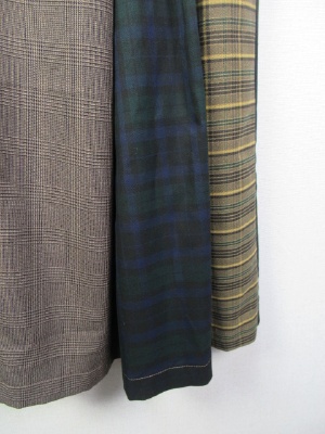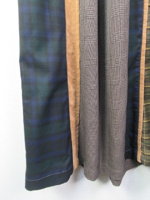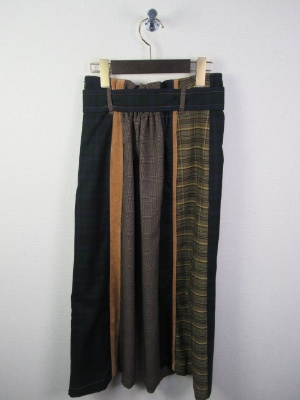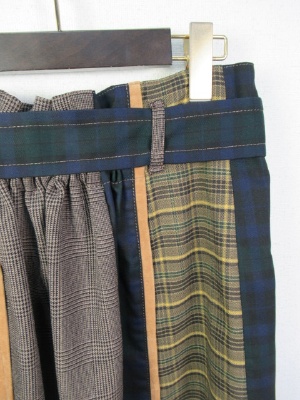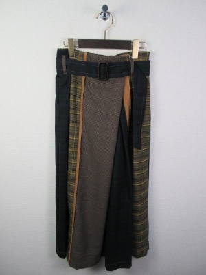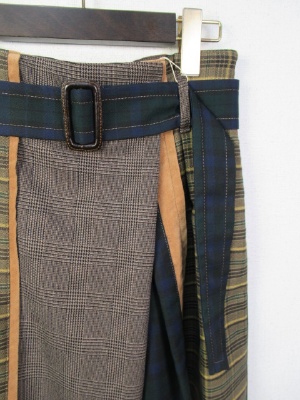 4種類の生地が組み合わさったスカート、ハイウェスト、ベルト付き、ラップ風デザイン