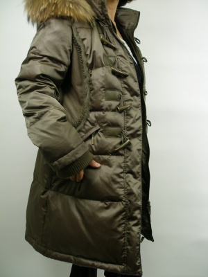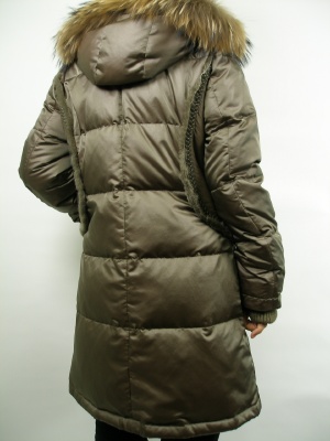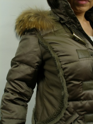 ボリュームのあるファー衿とシェイプしたウエストラインがキレイなダウンコート。 ファーはラクーン、ウエストの両脇はムートン、その他レザー部分は羊革。