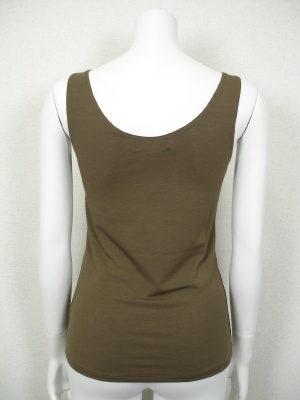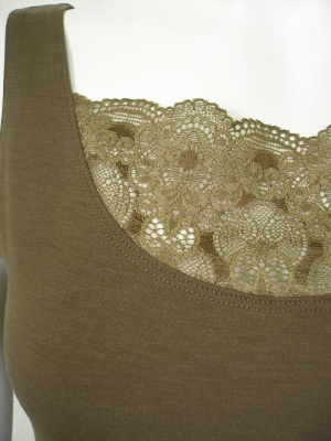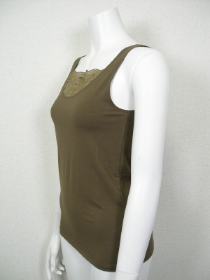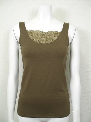 胸元のレースがポイントのタンクトップ。レースも含めてストレッチが効いているので着やすく、重ね着してもかさばりません。