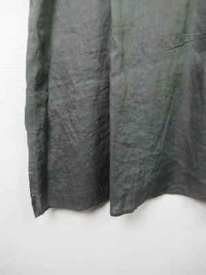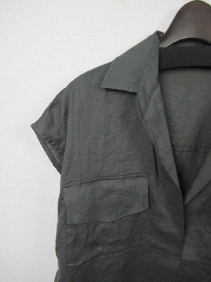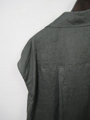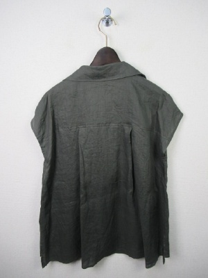 スキッパー襟の麻シャツブラス、手洗い可能、後ろ切り替えから下に2つタックデザイン