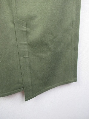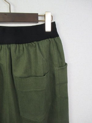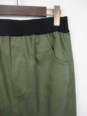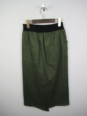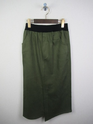 ウェストゴム(黒)のタイトスカート、前スリットデザイン(前裾が長め)、ストレッチ生地、裏なし、手洗い可能