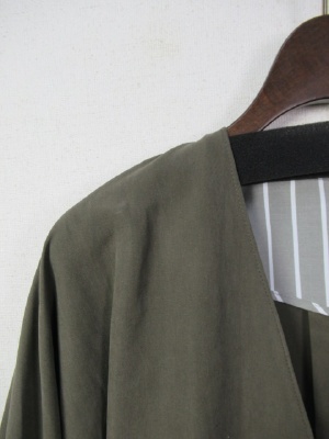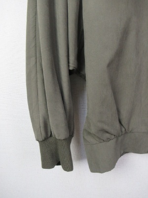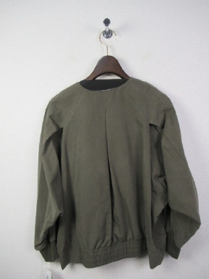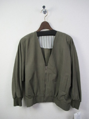 ノーカラーのショートブルゾン、前ファスナー、後ろ中央タック入り、ドロップショルダー、後ろ裾はギャザーゴムでしぼったデザイン