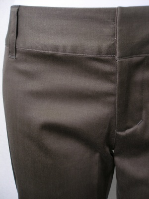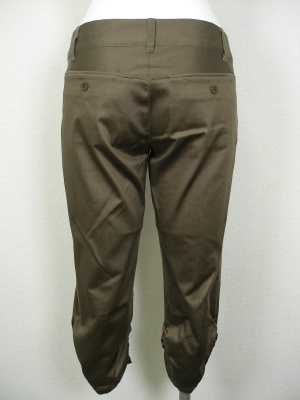 やや光沢があり、ストレッチの効いたクロップドパンツ。裾のギャザーがポイント。