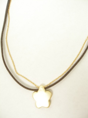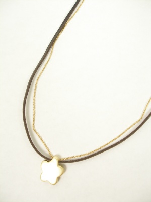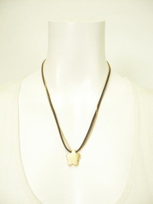 カラー「ゴールド」はライトブラウンの革紐でハートのトップ、「ダークブラウン」は焦茶の革紐に花のトップで、トップとチェーンの色は同じです。