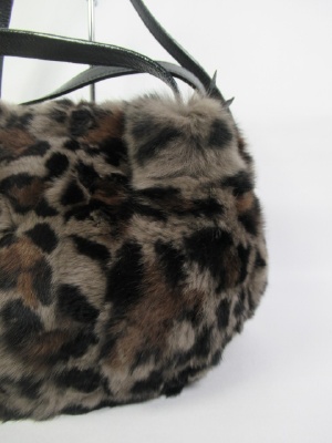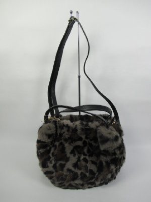 ラビットファー、持ち手は牛革、取り外し可能なショルダーベルト付き、天ファスナー、内ポケットあり