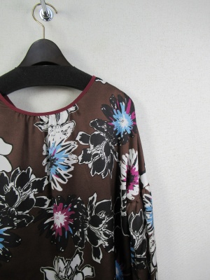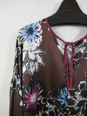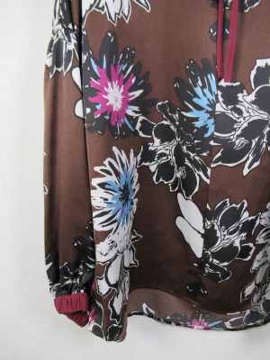 花柄ブラウス、首周りと袖口のトリミングはそれぞれ色が違う(ベージュ→グリーン・ネイビー→キャメル・ブラウン→ピンク)袖は途中切り替えでその下がボリューム袖になっている、手洗い可能