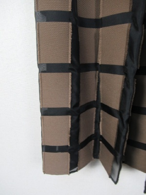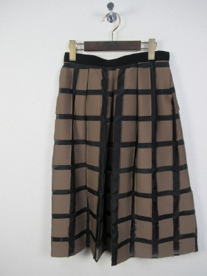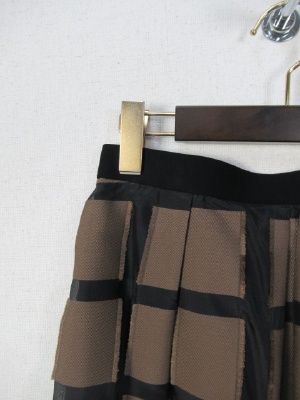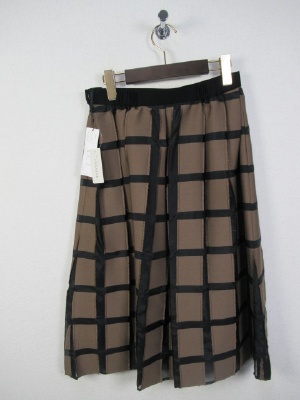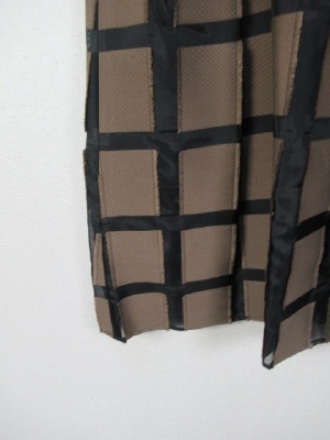 パッチワークに様な格子になった生地 黒のところはサテン地にようでやや透け感 茶系の生地は周りがフリンジ仕上げに インベルは黒 横ファスナー 裏地あり ブラウスとセットになる