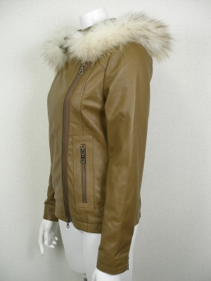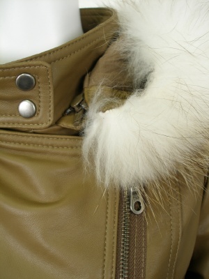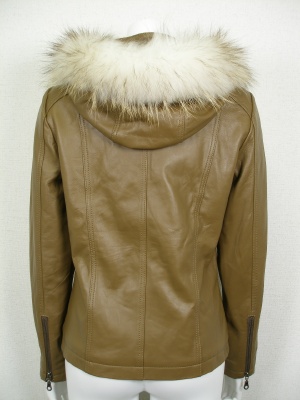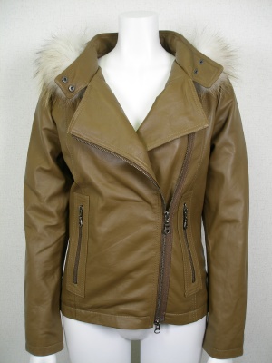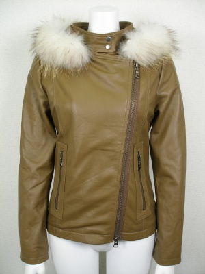 ベルトの付いていないスッキリしたデザインのライダースジャケット。ラクーンファーの付いたフードはジッパーで取り外せます。(ファーは縫いつけ)