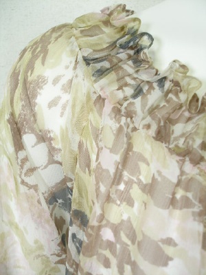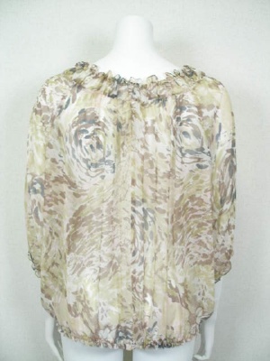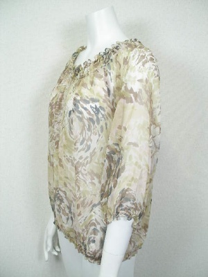 シフォンのふんわりブラウス。淡い水彩画のような大きめの花柄です。ネックライン、袖口、裾にゴム入り。