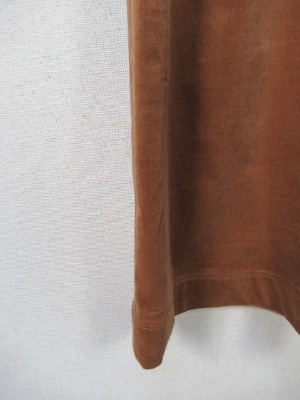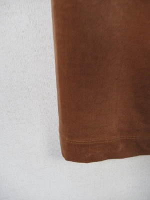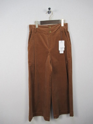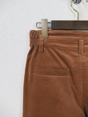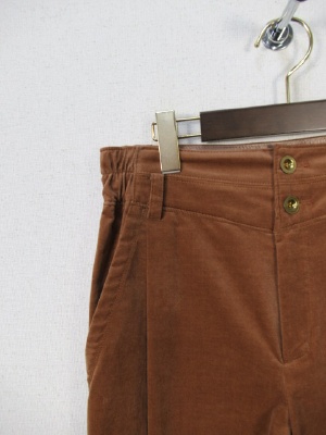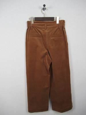 別珍素材のハイウエスト 前のタック入りワイドパンツ フルレングス裏地なし サイドポケット ヒップの位置に貼りポケット