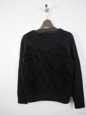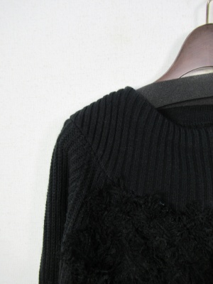 ややしっかりした編み地 前はフリンジをアレンジして模様にしたデザインニット