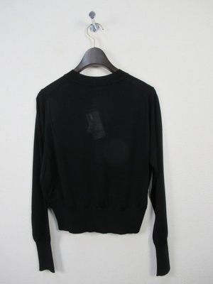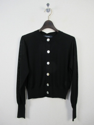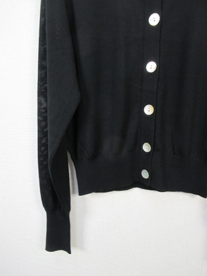 コンパクトなクルーネックのカーデ 薄手の夏仕様糸 大きなシェルボタンが特徴 セットできるインナーニット有り 手洗い可能
