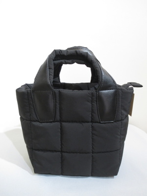 キルティングのコンパクトなバケツ型バッグ、天ファスナー(ダブルジップ)、グログランのショルダーベルト付き