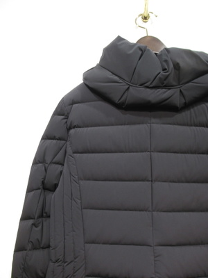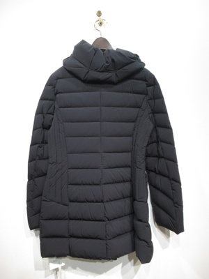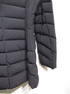 ヒップが隠れる長さのダウンコート フロントファスナーとボタン ストレッチ生地伸縮性あり