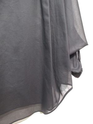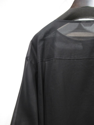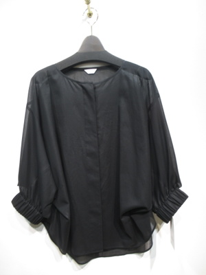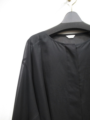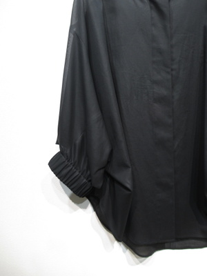 ドルマンスリーブ、襟無し、前開き比翼ボタン、袖口幅広ゴム入り、裾はラウンド型、手洗い可能