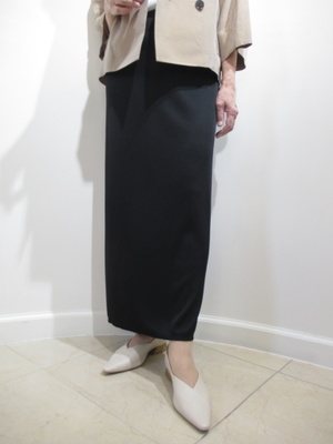 テレコ素材のタイトスカート、ウェスト幅広ゴム入り、後ろヒップ部分貼りポケット、後ろスリット(36cm)、裏地無し、手洗い可能