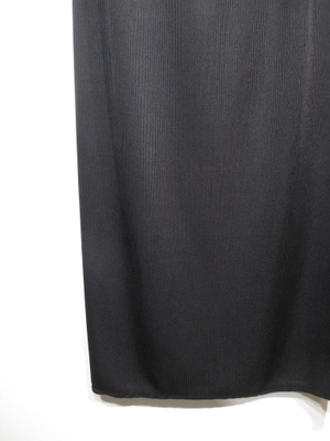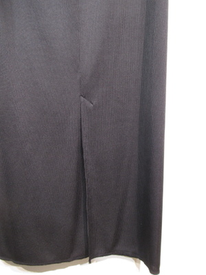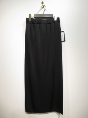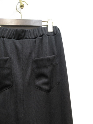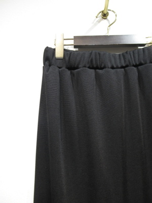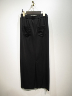 テレコ素材のタイトスカート、ウェスト幅広ゴム入り、後ろヒップ部分貼りポケット、後ろスリット(36cm)、裏地無し、手洗い可能