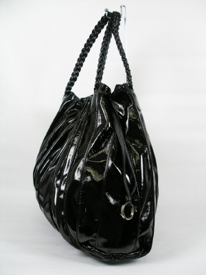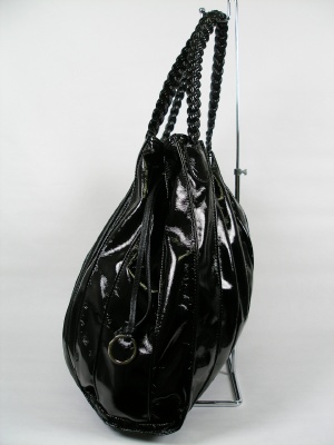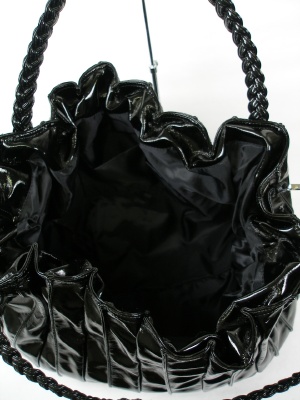 両サイドのリング付きの紐を絞ると写真のように上がクシャッとなり、広げれば大きく開くのでとても使いやすいバッグです。
