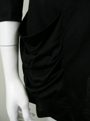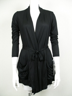 ポケットのドレープが印象的なロングカーディガン。ベルトを後ろで結んで前を開けた着こなしもおすすめです。