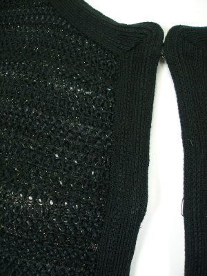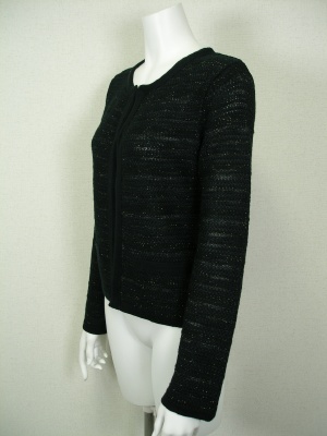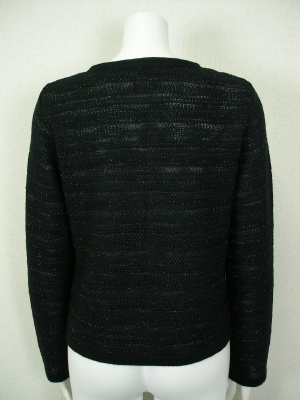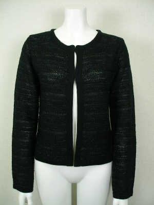 裏地なしのニットジャケット。控えめに入ったラメ糸が上品です。フロントはカギホック2つ。