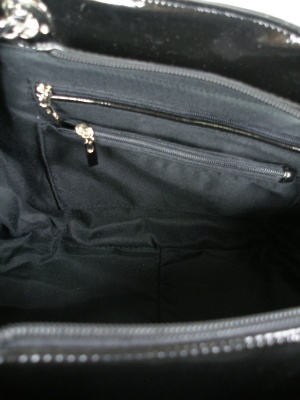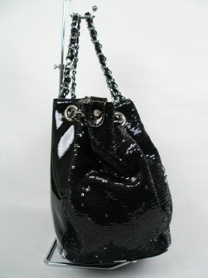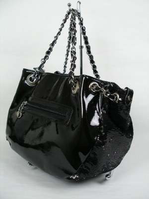 キラキラスパンコールとエナメル風の素材を組み合わせた大きめバッグ、天ファスナー、外ポケットもあります。紺と黒
