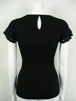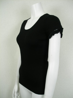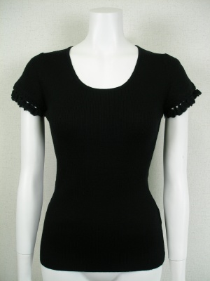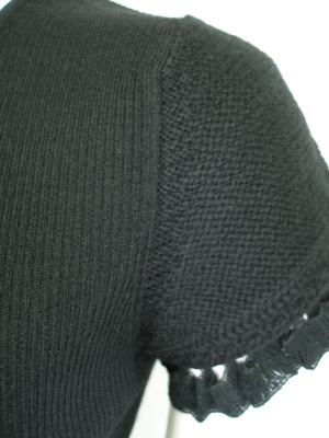 袖口にカギ針編みのフリルをつけたフェミニンなニット。身ごろはリブなので、スカートにインしやすいデザインです。