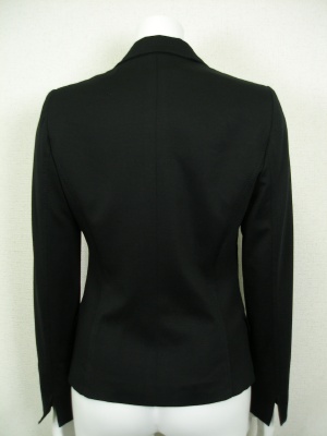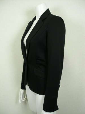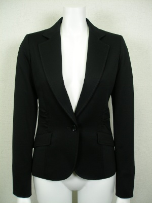 細身の一つボタンテーラードジャケット。ギャザーでさらにウエストを細く見せます。ストレッチが効いていて着やすく、シワになりにくい素材です。
