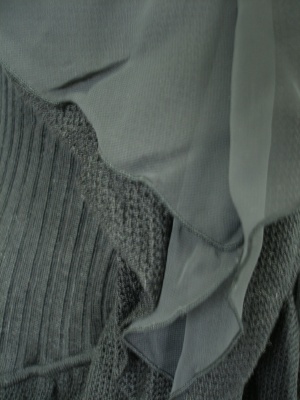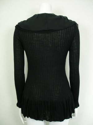 ヒラヒラの襟にシフォンを重ねたエレガントなニットカーディガン。やや長めの着丈でウエストを絞ったデザイン。