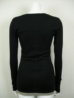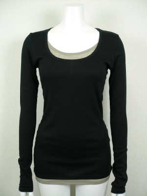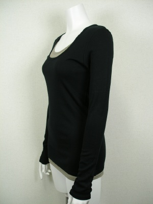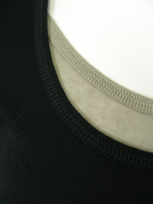 胸元と裾に違う色の生地を重ねて、タンクトップを重ね着しているみたいに。長めの着丈や袖が重ね着に便利です。
