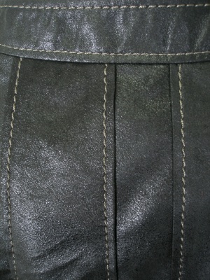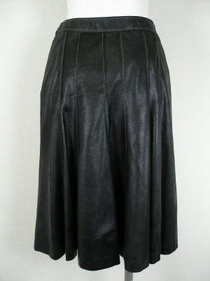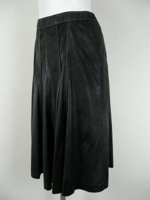 柔らかいフェイクレザーのような質感。腰周りはスッキリ、裾に向かって広がるデザイン。裏地付き。