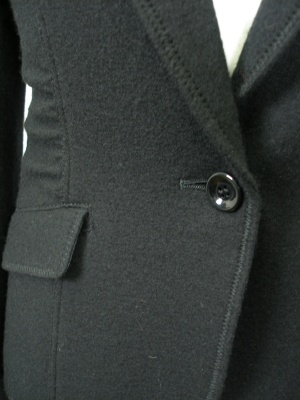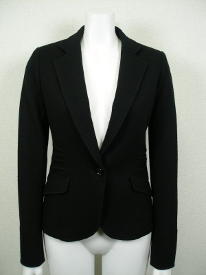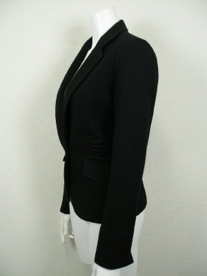 タイトなデザインとウエストのギャザーでスッキリ見せるジャケット。裏地付き。お勧め商品(下の欄)のスカートとパンツは同じ素材ですのでスーツになります。