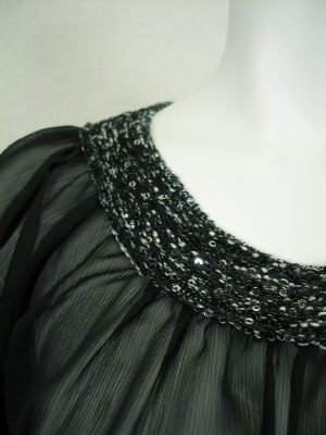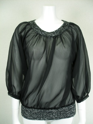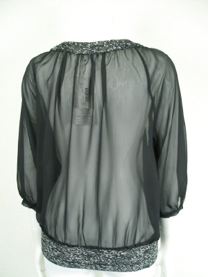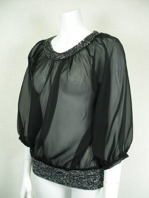 透け感のあるふんわりブラウス。衿周りと裾はツイード地の若干伸縮のあるニットを用いてブラウジングしやすい。