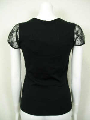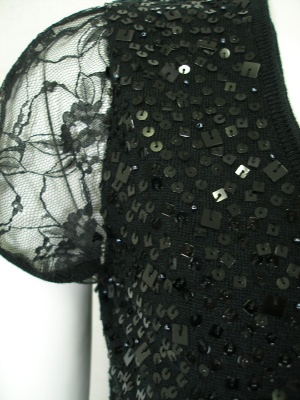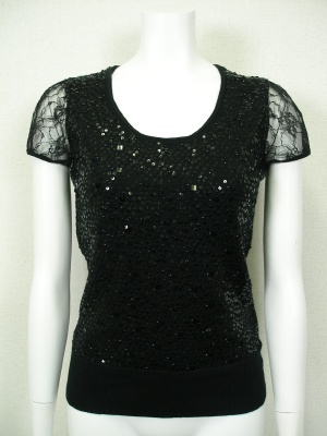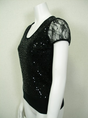 生地と同系色のスパンコールを散りばめてあり、お袖はレースを使ったフェミニンなニット。
