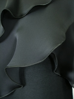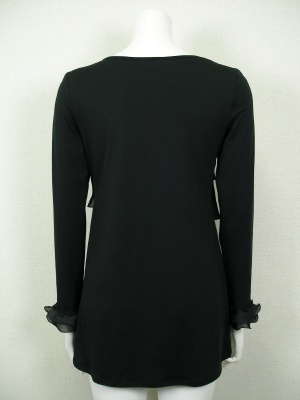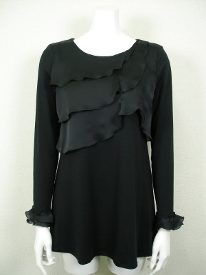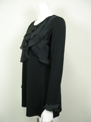 身頃とお袖はストレッチの効いたカットソーで、胸元と袖口のフリルはポリエステル。裾がやや広がったチュニックタイプ。