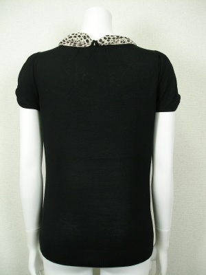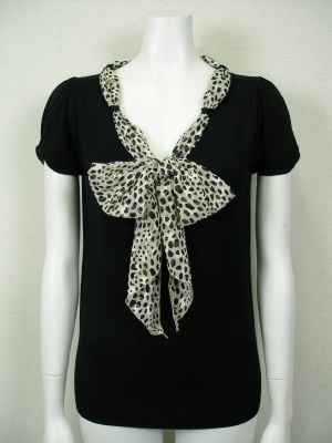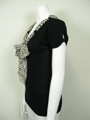 柔らかい素材のVネックニット。ネックラインのループにアニマル柄のスカーフ(ポリエステル)を通してあります。