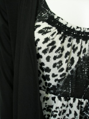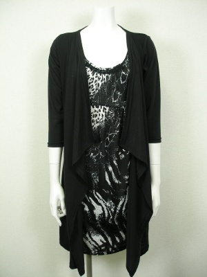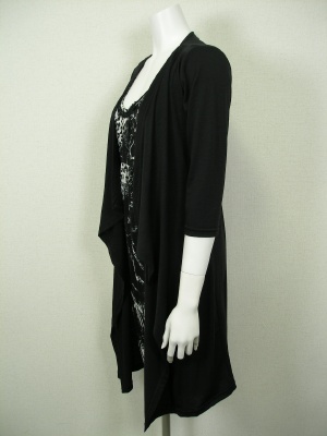 ワンピースの上にカーディガンを重ねたように見えるデザイン。実際は柄の部分は前身ごろのみで、脇でカーディガンとつながっています。フランス製。