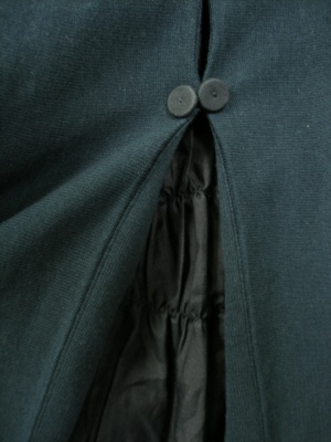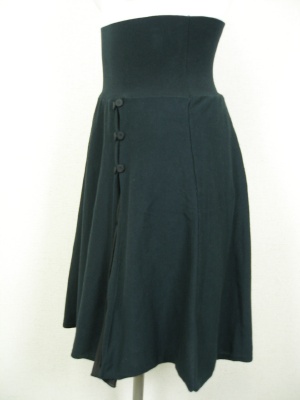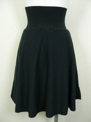 リブのウエストでラクに穿けるニットスカート。前の斜め左側から別素材(コットン・シルク)がチラリとのぞきます。ポリエステルのペチコート付き。