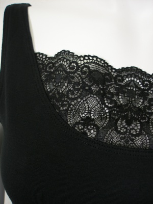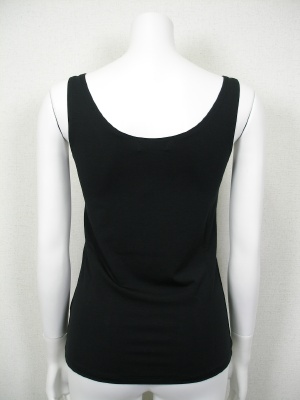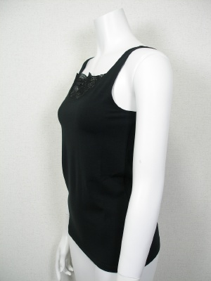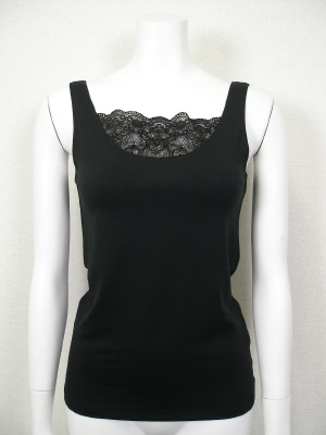 胸元のレースがポイントのタンクトップ。レースも含めてストレッチが効いているので着やすく、重ね着してもかさばりません。