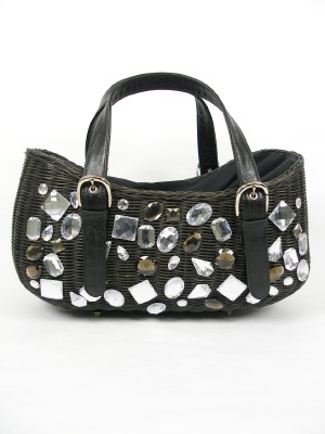 天然素材のキラキラ付きカゴバッグ。ストラップは合皮。内側は布が貼ってありポケットも付いています。上は巾着状に絞れるタイプ。
