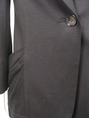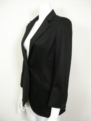 シワになりづらいラクな着心地のロングジャケット。サイドのタックを寄せたポケットがアクセント。薄い肩パッド入りで裏地なし。75328のパンツと同じ素材。