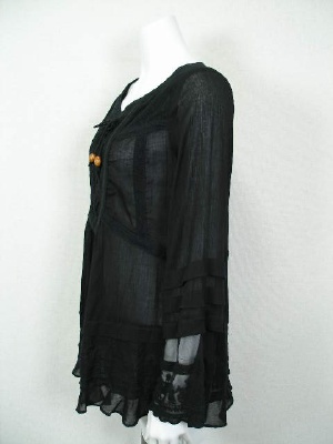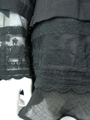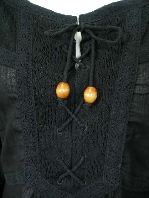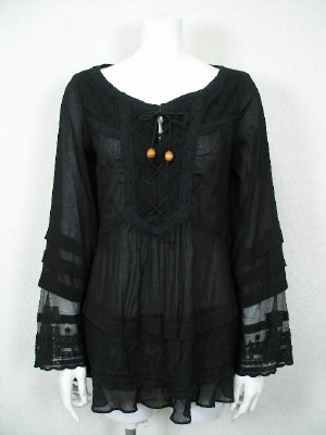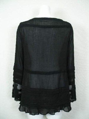夏らしくて涼しげなチュニック。Aラインでフレアースリーブです。色んなタイプのレースが華やかさも添えてくれます。袖口のレースはフォークロアなお人形柄。