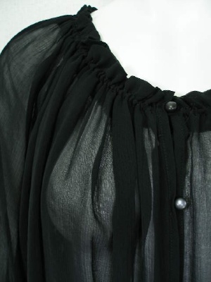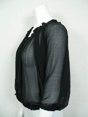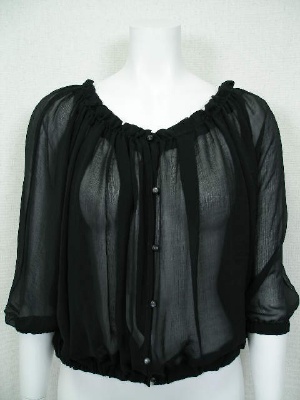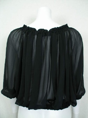 シフォンのドルマンスリーブブラウス。ネックライン、袖口、裾はゴム入りでふんわりしたシルエットに。前開きなのでボレロのように使ってもOK。