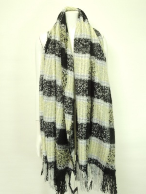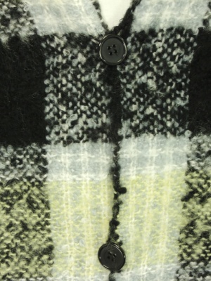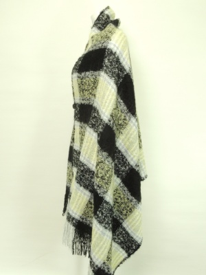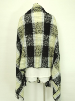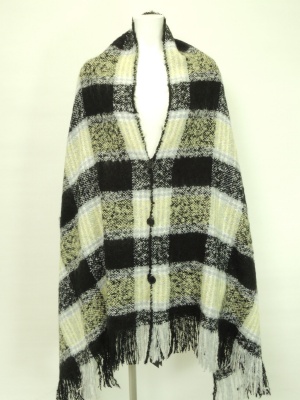 チェックの大判ストールで、ボタンを留めるとポンチョになります。